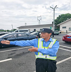 “師傅,這邊停車位空著,小心慢行!”小黃山服務(wù)區(qū)內(nèi)車流如織,保安鄭龍品身著反光制服,一邊引導(dǎo)車輛有序停放,一邊耐心解答司乘疑問(wèn),額角的汗珠順著臉頰滑落,卻絲毫未影響他專注的神情。