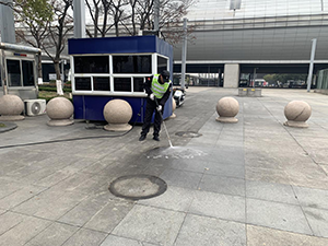 北廣場(chǎng)原石球點(diǎn)位因長(zhǎng)期放置,地面形成了深色積塵圈,不僅影響視覺美觀,還易藏納雜物。接到任務(wù)后,衛(wèi)生保障小組第一時(shí)間調(diào)配高壓沖洗設(shè)備,由 2 名組員組成作業(yè)小隊(duì),提前規(guī)劃沖洗路線:先采用高壓水槍對(duì)積塵圈進(jìn)行定點(diǎn)沖刷,利用水流沖擊力溶解深層積塵;對(duì)頑固污漬區(qū)域,配合專用清潔劑進(jìn)行二次擦拭,再用清水反復(fù)沖洗,確保無殘留痕跡。
