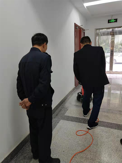 9月下半旬項目主管在日常每周檢查衛(wèi)生以及安全時,發(fā)現(xiàn)五樓會議層電梯門口以及一樓接待大廳的地磚花崗巖石材都有深淺不一的污痕,地面顯得非常臟亂,在使用潔而亮堿水等一系列清潔方式之后都沒有很好的效果。就去跟特種設(shè)備安全監(jiān)督檢驗研究院甲方建議是否需要借助外力來恢復(fù)地面整潔,結(jié)果是需要借助外力,項目部聯(lián)系公司總部派專項技術(shù)人員來看了下覺得需要翻新地面,情況匯報甲方后決定自己購買翻新機,2019年10月29日機器藥劑以及人手都準備好的情況下,劉師傅姜師傅開始觀摩公司專項技術(shù)人員怎么安裝翻新機并且記錄步驟,從后廚門口開始做翻新地面,更換磨片開始翻新,姜師傅以及劉師傅并且周邊單位過來觀摩現(xiàn)場學(xué)習(xí)機器使用與注意事項,藥劑的比例, 29日學(xué)習(xí)了翻新技術(shù),30日上午鄧師傅開始示范拋光地面,要換上別的紅磨片開始新的步驟,劉師傅姜師傅也積極在旁邊記錄以及學(xué)習(xí),以方便今后地面的維護保養(yǎng)。這一次我們學(xué)習(xí)到了地面的翻新打磨拋光以及打蠟,一次維護能夠長時間保持地面的干凈整潔。