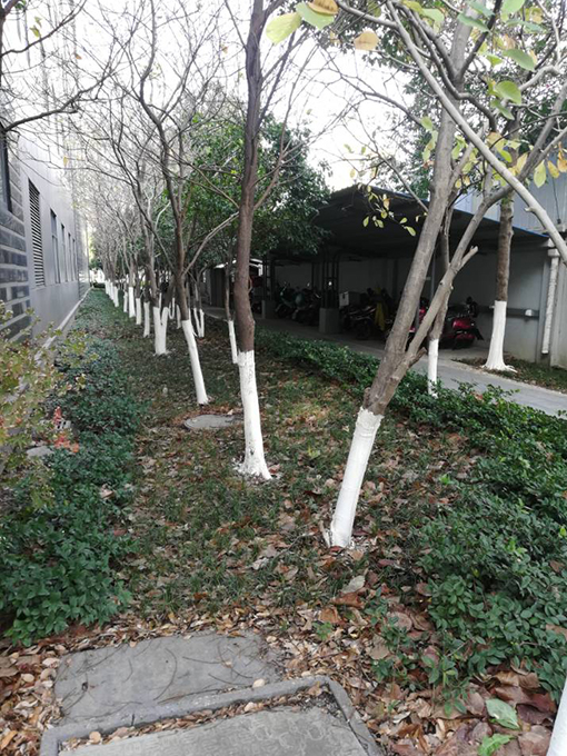 一年一度的冬季已經(jīng)來(lái)臨,人們都穿上了厚厚的冬裝,做上了保暖措施。園區(qū)里面的大樹(shù)是不是也要過(guò)冬了呢?特檢院項(xiàng)目部主管通過(guò)網(wǎng)上查詢發(fā)現(xiàn)冬天樹(shù)木涂白可以起到防凍的功效,預(yù)防冬季的凍害,還能防止病菌侵入,提高樹(shù)的長(zhǎng)勢(shì),涂白劑有一定的營(yíng)養(yǎng),可以促進(jìn)果皮的健康,提高樹(shù)木的抗病能力,既防凍又有殺蟲(chóng)的雙重作用。特別是對(duì)在樹(shù)皮里過(guò)冬的螨類、蚧類等殺傷力尤佳,樹(shù)木涂白亦可起到美化作用。