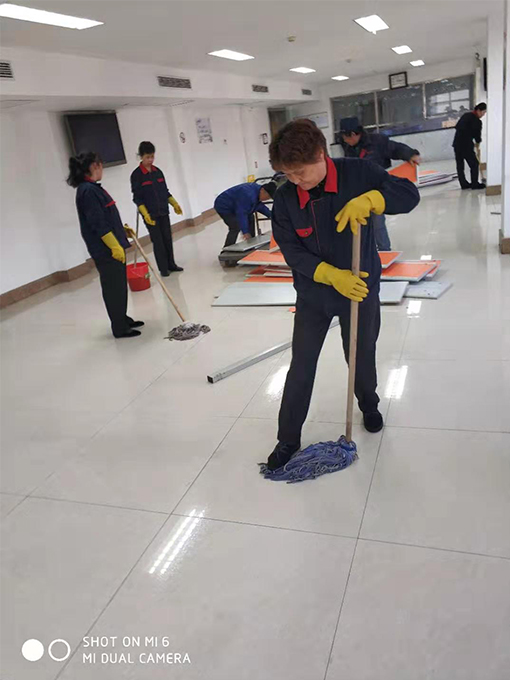 本次大掃除主要去除了窗口上凌亂張貼的宣傳圖片,做到窗明幾凈;并利用這次機(jī)會(huì)徹底清除地面油污,減少因油污滑倒的可能;雖然在做完自己本職工作后幫助食堂打掃衛(wèi)生,但我們的保潔人員卻都沒(méi)有怨言,大家分工明確、沒(méi)有盲區(qū),利用這次更換餐桌椅的機(jī)會(huì),每個(gè)人拿著清掃工具認(rèn)真清掃餐廳各個(gè)角落,餐廳里一片繁忙的景象。她們?cè)诒嵵鞴艿膸ьI(lǐng)下,忙活了將近一個(gè)下午,至到掃除結(jié)束后,保潔員們一個(gè)個(gè)都是滿頭大汗,但看著干凈、整潔的餐廳,大家的心情也都非常舒暢,并且她們的高效率得到了甲方領(lǐng)導(dǎo)的肯定!