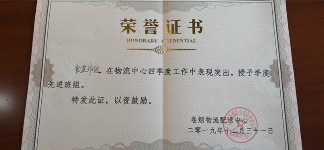 隨著2019年尾聲,迎來2020年的鐘聲,總結(jié)2019年的工作,高正集團(tuán)煙草項(xiàng)目部各部門員工都得到了甲方領(lǐng)導(dǎo)的認(rèn)可,最值得慶賀的是煙草物流食堂班組,因在物流中心四季度工作中表現(xiàn)突出,授予甲方領(lǐng)導(dǎo)頒發(fā)的季度先進(jìn)班組榮譽(yù)證書稱號(hào)。