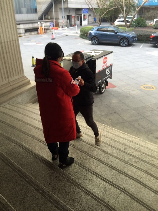 在大樓的證券公司業(yè)主向投資廣場項目部發(fā)來了緊急求援,他們的消毒水用的不夠了,這樣會大大降低每天防疫消殺作業(yè)效果。投資廣場項目部葉佳在自身防疫消毒水不足的情況下,主動提出可以帶一瓶消毒水給18樓業(yè)主。在全員帶口罩的情況下,要尋找辨認(rèn)一個人還是比較困難的。只見葉佳每天早早就來到大樓的測溫點認(rèn)真的給每一位進(jìn)入大樓的工作人員測溫,一邊尋找業(yè)主。突然就見葉佳拿出一瓶消毒水跑下臺階給一個人,邊給邊說:“您好,您要的消毒水”,業(yè)主連連道謝。