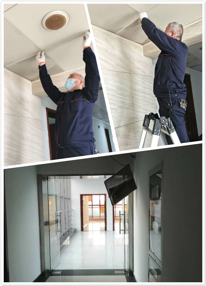 4月7日,清明小長假過后第一天,保潔阿姨發(fā)現(xiàn)樓道的天花板掉了下來,隨手就拍了照片到我們的工作群里,這就等于給維修師傅安排了工作,賀師傅拿著撐梯和工具來到了現(xiàn)場,三下五除二就把天花板給修好了。