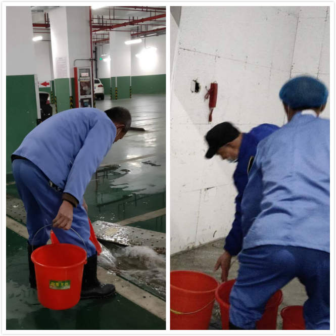 此刻正是下班時(shí)間,趁工友們還沒(méi)走遠(yuǎn),項(xiàng)目經(jīng)理連忙打電話(huà)給王師傅和黃師傅倆人馬上回來(lái)處理積水,并叫上值夜班的師傅一起幫忙。到現(xiàn)場(chǎng)一查看,發(fā)現(xiàn)情況比較嚴(yán)重,整整兩間屋子地面都是水,三位師傅知道這工作量挺大而且緊急,連忙換上雨鞋開(kāi)始工作。他們分工合作,一個(gè)人舀水,一個(gè)人提著倒水,另一位師傅就用洗地機(jī)吸水,配合得很默契。經(jīng)過(guò)三個(gè)多小時(shí)的清理,終于把兩間屋子里的水都清理干凈了!