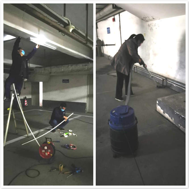 在關(guān)閉車庫的同時(shí),項(xiàng)目部組織工程部和保潔對(duì)大樓的地下停車庫燈光進(jìn)行更換維修,對(duì)地面進(jìn)行吸塵清掃。一大早工程部的師傅們就拿上檢修工具早早的來到地下車庫,逐一對(duì)車庫里的照明燈進(jìn)行排查。在排查的過程中發(fā)現(xiàn)有一盞照明燈壞了,為了方便業(yè)主停車也為了停車的安全,師傅們拿出維修工具和新的燈管對(duì)線路進(jìn)行重新排布。在師傅們對(duì)車庫線路的改造的同時(shí),投資廣場(chǎng)保潔部的工作人員也利用這次機(jī)會(huì)對(duì)車庫也來個(gè)大清潔。為了不揚(yáng)起大的灰塵,只見何秋萍拿著大功率的吸塵器對(duì)地面進(jìn)行吸塵。不一會(huì)兒,師傅們也弄好了,何秋萍渾身上下弄了一身灰,但是看著地下車庫里一片明亮和整潔,他們都會(huì)心的笑了。