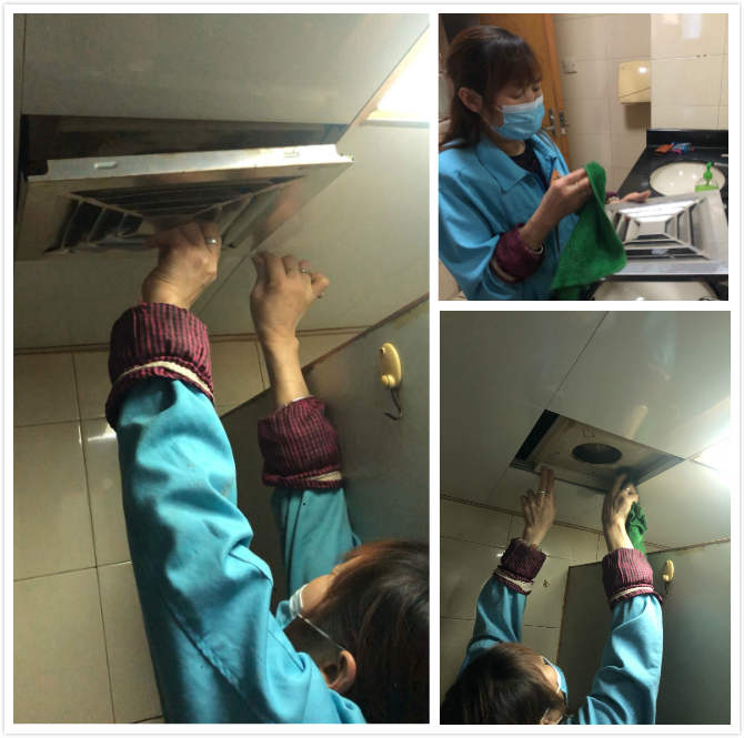 首先,需要小心的拔下排氣扇,松開(kāi)前后螺絲,輕輕地取下排氣扇的后蓋,拉出排氣扇的連接器,然后將過(guò)濾器和后蓋一起拆下來(lái)。接下來(lái)用洗滌劑和水調(diào)配到適當(dāng)?shù)臐舛,由于大樓一樓、三樓和五樓衛(wèi)生間,是男士衛(wèi)生間,煙漬、頑漬比較厚重,則用熱水和洗滌劑將過(guò)濾器和后蓋放入容器中,洗滌10-15分鐘,最后沖洗干凈后將過(guò)濾器和后蓋重新安裝到原始的位置。由于項(xiàng)目部保潔主管一直非常注重衛(wèi)生的細(xì)節(jié)方面的培訓(xùn),通過(guò)了半天時(shí)間的清洗工作,十多扇排氣扇都被阿姨洗得光亮如新?粗簧壬惹鍧嵧戤叺呐艢馍龋芍愿袊@保潔阿姨不僅要把平日里的日常工作做好,而且還要很熟知相關(guān)技術(shù)、技巧。真是了不起!