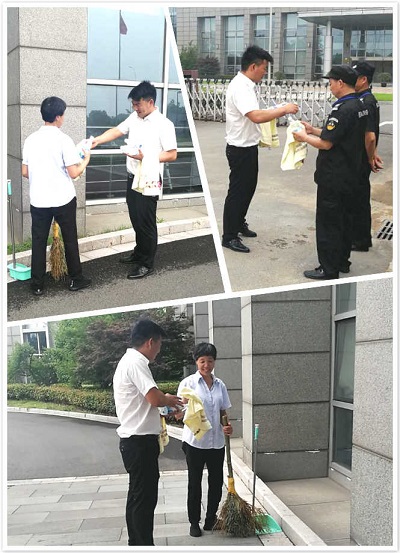 2020年6月11日上午9點,與往年一樣,每到大夏天,高正集團(tuán)就記掛著奮戰(zhàn)在高溫酷暑一線工作的物業(yè)員工們。公路事業(yè)發(fā)展中心項目部經(jīng)理丁東威,一大早就給員工們送來了清涼,發(fā)放鹽汽水、風(fēng)油精、藿香正氣水、毛巾、人丹等夏令用品。