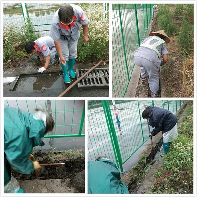 溧陽駕培中心科三大車場地本是A2大車訓(xùn)練的場地,現(xiàn)被改造成A2大車考試的場地。此場地因原本只用做訓(xùn)練從未進(jìn)行過打掃,地溝也從未清理過;現(xiàn)因要用作考試,為確保不影響大車正?荚,項(xiàng)目部安排了兩名保潔對大車場地邊的淌水溝進(jìn)行清理工作。地溝寬度較窄,里面全是磚頭、泥土,鐵鍬鏟不動(dòng),只能用小鋤頭先將磚頭扒開,用手撿出來。這兩日梅雨日,下著大暴雨,地溝堵塞,大車場地邊角被淹全是水,地溝里的泥變成了爛泥,既有水又有泥,這又給保潔增加了清理難度。我們的保潔員身穿雨衣、腳穿雨鞋、手帶乳膠手套,冒著雨在進(jìn)行清理。一名保潔用小鋤頭將地溝里的磚頭扒起,用手一塊一塊的揀出,另一名保潔員用圓頭鐵鍬側(cè)著對地溝里的泥進(jìn)行清鏟,雖然她們?nèi)蔽溲b,仍被淋濕,身上也沾滿了泥,但她們?nèi)允锹耦^苦干,不辭辛苦。雖體力有限,但干活卻是不含糊的,既然要做,那就要做到最好。