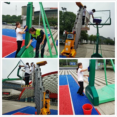 近期3V3籃球賽即將在奧體會展中心前面的廣場上舉行,甲方安排師傅們把籃球框安裝好后發(fā)現籃板上比較臟,需要清理干凈,就打電話給奧體中心項目部,溝通希望保潔去清理下。