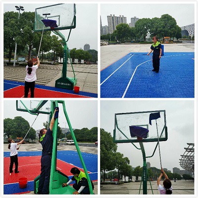 經過半小時,大家把籃板弄得干干凈凈,最后地面上還噴灑了消毒劑。甲方領導來看后非常滿意,稱贊我們做事細心、靈活。
