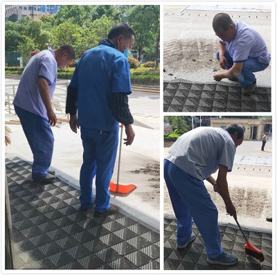 于是,主管連忙打電話給醫(yī)院總務(wù)科說明情況,他們立即派了兩個木匠先把損壞的玻璃門敲下來。由于敲的時候碎小的玻璃灑落在門外面的防滑墊子上,有一定的安全隱患,所以主管馬上安排項目上的機動工友開始清理碎玻璃片,并將之前堆積的灰塵全部清理干凈。他們先把防滑墊翻過來,把能拍掉的碎屑先拍掉,再用手把剩余的拍不出來的碎玻璃一點一點撿起來,撿的差不多了,再把防滑墊放回原地,并且將防滑墊四邊踩平,最后,三個師傅再把清理出來的垃圾全部清理掉。