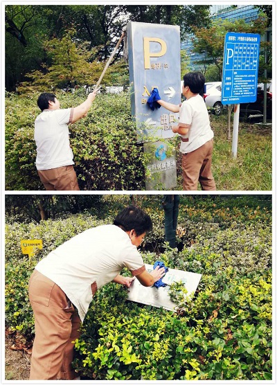 9月15日,由于下雨,園區(qū)外場的各類指示牌上有了不同程度的污漬,看上去灰蒙蒙的,于是保潔員們決定利用閑暇時間來把它們擦拭一番。她們用洗潔精水把大樓地下車庫入口處的指示牌擦一遍,再用清水洗干凈,指示牌就褪去暗淡,變得干凈而醒目,其他的各類指示牌也如法炮制擦洗干凈。