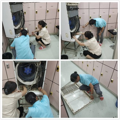 雖然空調是放在室內的,但里面的灰塵可一點都不少,在更衣室工作的保安也主動幫忙。她們先把擋風板輕輕拆下來,把濾網(wǎng)全部拿到水龍頭下面,一邊用刷子刷,一邊沖洗。雖然隔段時間就打開清理,但里面還是很多臟東西。她們找來細鉛絲、板刷、抹布等工具,慢慢伸進去,從里往外一點一點把垃圾清理出來。真是看不出來,里面居然這么臟,清出來的垃圾足足有一垃圾袋。清完再用刷子刷,抹布擦,兩人蹲在地上腿都麻了,雖然不是力氣活,但也熱得出了一身汗。最后再把濾網(wǎng)、擋風板全部裝上,重新啟動空調,吹著涼涼的風,頓時感覺空氣好像也清新了不少。
