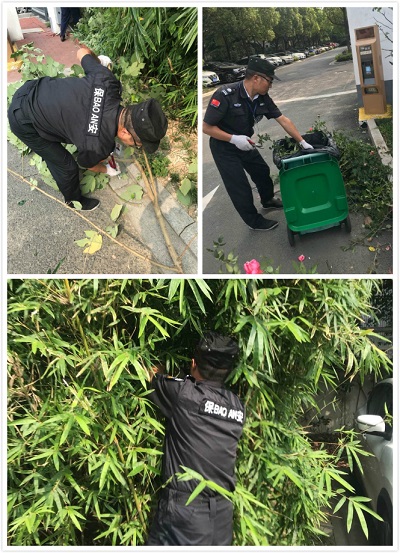 水務(wù)大廈外圍的綠化樹木已經(jīng)從原來的小樹苗長成參天大樹,背面停車場通道上,有的樹枝已經(jīng)延伸到路當中,擋住了路人的行走視線,有的長得高超過了電線桿、遮住了路燈,使得路燈在晚上照明亮度有限。為了更好的服務(wù)于甲方,讓每一個人都身在一個干凈明亮舒適的環(huán)境中工作生活,項目部員工自己找來工具,準備對過于茂盛的樹枝進行修剪。路邊帶刺的月季花的枝葉長到了路當中,就戴上手套把它修剪掉,長得太高的枝葉用鐮刀割下,讓路燈露出了頭。不一會會就修剪出一大堆樹枝,為了更好的方便垃圾清運,把工作做到細致,員工們又用剪刀把樹枝剪成一段一段,用垃圾袋裝好堆放到固定點。