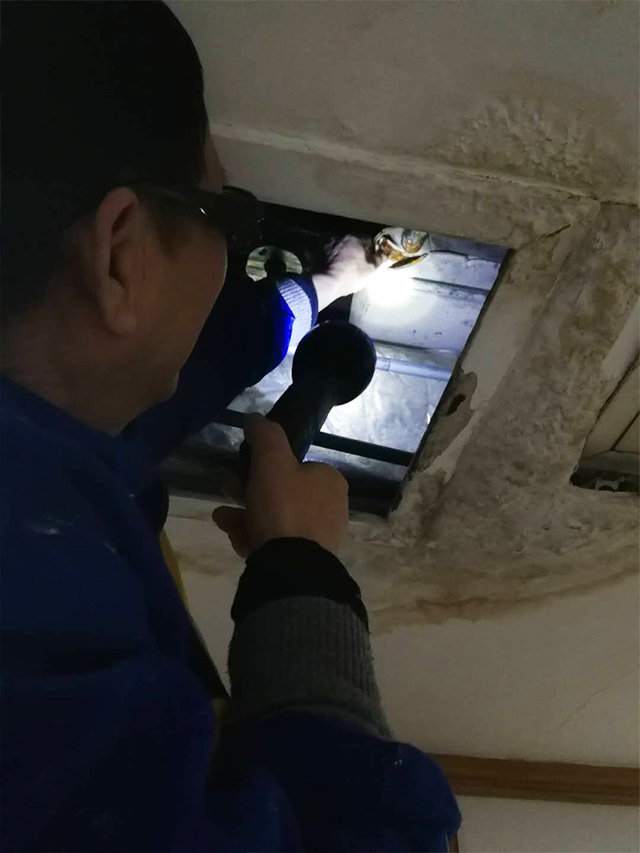 作為一個專業(yè)的物業(yè)公司,每天的各樓層例行檢查是固定的項目。近期的巡樓中發(fā)現(xiàn)了位于四樓的過道地面有小面積積水,懷疑是天花板管道破裂,巡查人員立刻聯(lián)系工程部師傅,工程部接到通知馬上帶上梯子與各種工具到現(xiàn)場進行搶修。