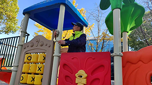 為了讓孩子們能在一個(gè)干凈、安全的環(huán)境中盡情玩耍,保潔人員付出了辛勤的努力。今天,保潔人員魏建明又拎著水桶、帶著抹布來到了這里。他先是仔細(xì)地檢查了每一個(gè)角落,不放過任何一處污漬和灰塵。接著,他用濕抹布認(rèn)真地擦拭著攀爬架的扶手、滑滑梯的表面,一遍又一遍,不厭其煩。遇到頑固的污漬,他還會(huì)蹲下身子,用刷子用力地刷洗,直到污漬消失不見。在保潔人員魏建明的努力下,原本有些灰暗的游樂設(shè)施重新煥發(fā)出了光彩,變得干凈整潔。